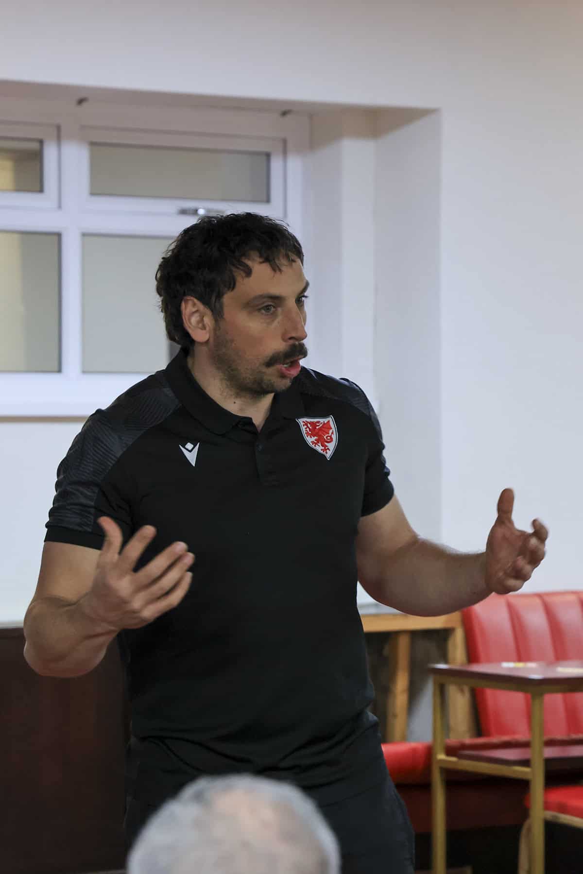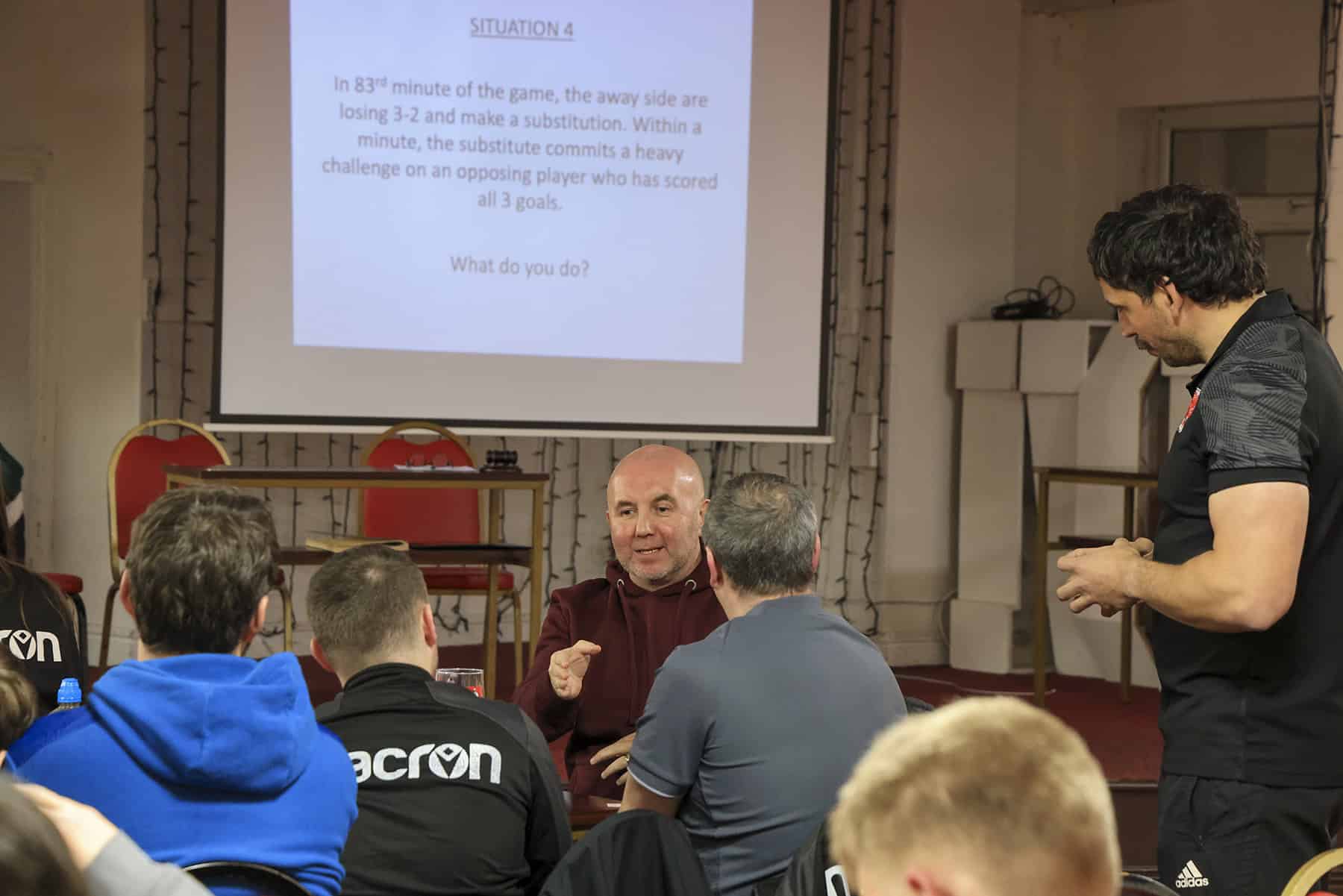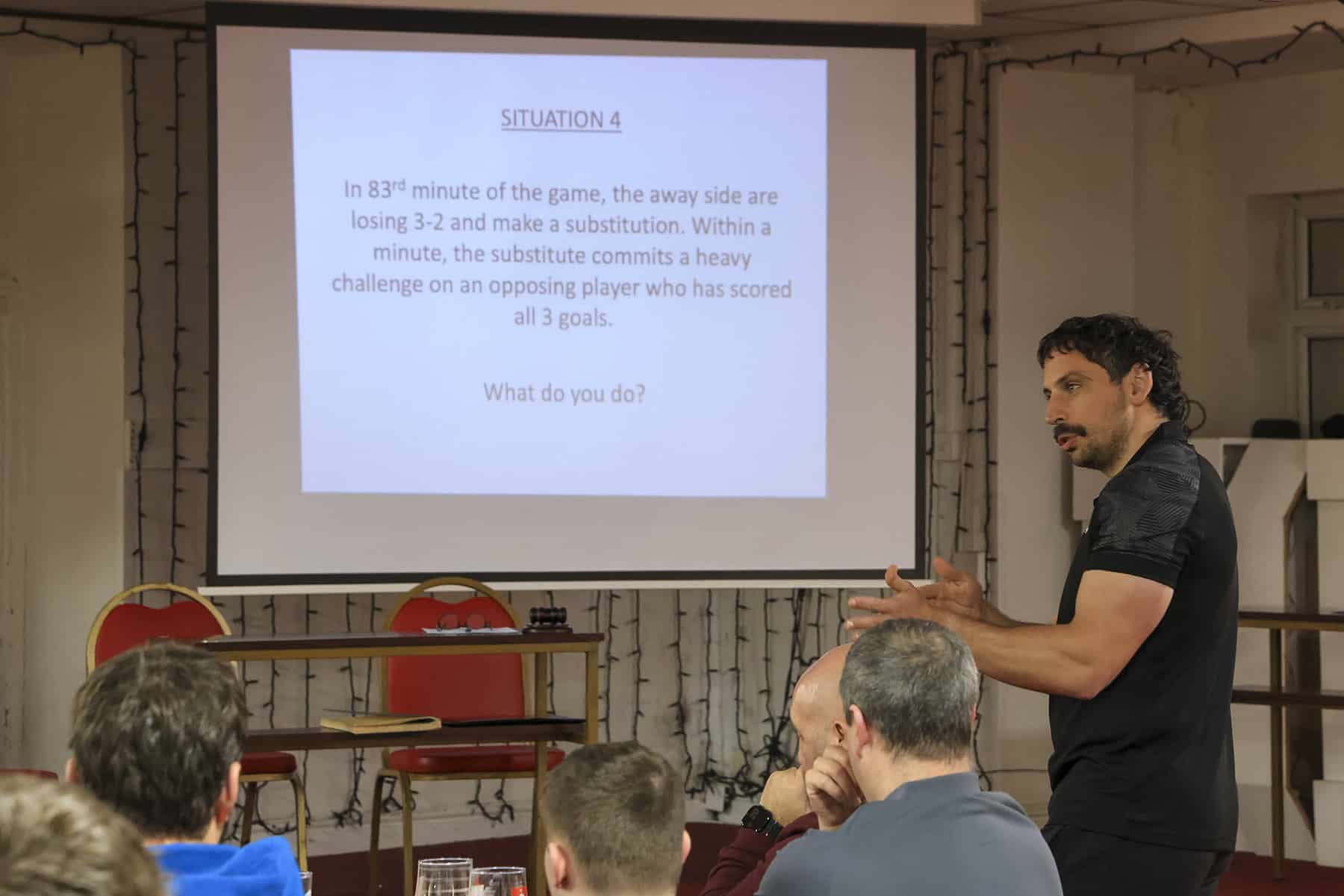 Welsh Premier League & FIFA Referee, Bryn Markham-Jones, led an excellent session discussing ten different real-game scenarios. In each instance, there was a "by the book" answer and a "best way to manage the game" answer. Our challenge was to decide which action was most appropriate in the context of the game.