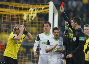 After 35 minutes, Wolfsburg's Dutch striker Bas Dost was played clear. His effort seemed to be blocked by Marcel Schmelzer's knee - but Stark gave a handball and sent off the Dortmund left-back.